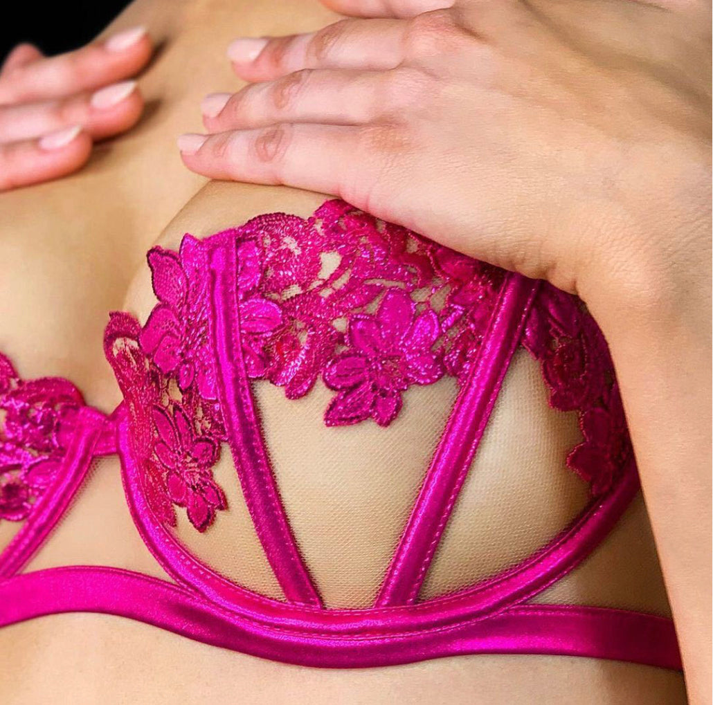 • Embroidered Open-Frame Bra: Features sheer, unlined cups adorned with premium floral embroidery. The unique "cut-out" architecture and additional strap detailing across the décolletage create a bold, modern silhouette.